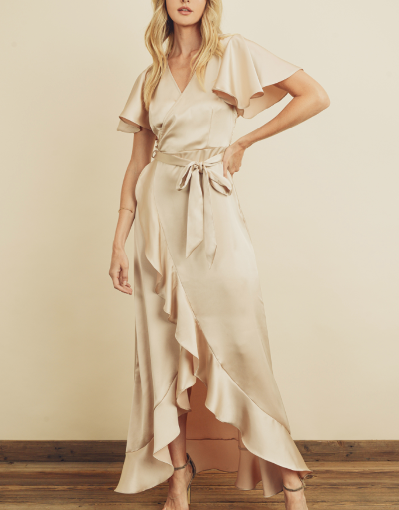Satin Ruffled Maxi Wrap Dress Adorn Boutique